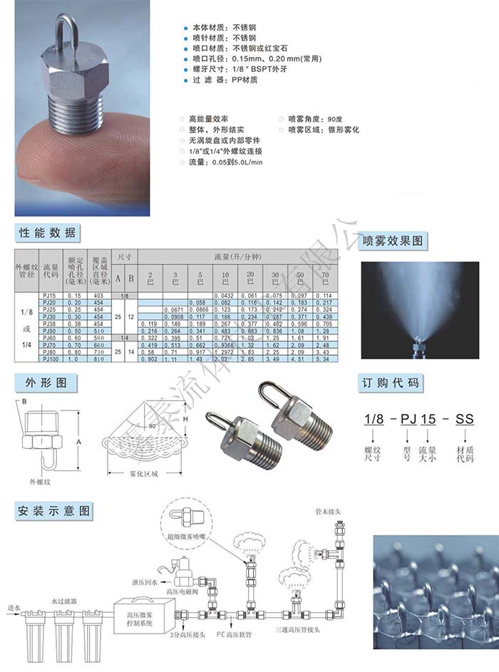 壓力式霧化噴嘴 撞擊式霧化噴嘴 撞擊式霧化噴嘴主要用于人工造霧工程、噴霧降溫、噴霧加濕工程等。具有噴霧量大、噴霧顆粒小的特點(diǎn)。上海霧泰流體技術(shù)有限公司 在線咨詢 產(chǎn)品詳情 撞擊霧化噴嘴設(shè)計(jì)特點(diǎn)本體材質(zhì):不銹鋼噴針材質(zhì):不銹鋼噴口材質(zhì):不銹鋼或紅寶石噴口孔徑:0.15mm、0.20 mm(常用)螺牙尺寸:1/8"BSPT外牙過 濾 器:PP材質(zhì)高能量效率整體,外形結(jié)實(shí)無渦旋盤或內(nèi)部零件1/8"或1/4"外螺紋連接流量:0.0580到5.0/min噴霧角度:90度噴霧區(qū)域:錐形霧化霧化液滴尺寸平均粒徑小于20μm撞擊式霧化噴嘴噴霧效果/外形圖 1、在這種直接壓力噴嘴中,由噴孔噴出的細(xì)液柱擊中正對著它的 直徑與噴孔孔徑相同的靶針,然后形成極細(xì)密的霧化, 在某些應(yīng) 用中,這種噴嘴甚至替代許多昂貴的采用壓縮空氣或蒸氣的二流體空氣霧化噴嘴。2、能夠產(chǎn)生極佳的霧化效果,讓人有置身云端的錯(cuò)覺,平均粒徑20 微米以下的超小噴霧粒徑,1優(yōu)異的霧化表現(xiàn),廣泛應(yīng)用園林景觀造霧、廠房加濕降溫、 農(nóng)作物花卉加濕、空調(diào)外機(jī)降溫等。(點(diǎn)擊圖片查看大圖) 撞擊式霧化噴嘴噴霧視頻 (視頻需要緩沖,請耐心等待一會(huì)兒...如視頻不能播放,可更換瀏覽器重試)<meta charset="UTF-8"/><meta content="IE=edge,chrome=1" http-equiv="X-UA-Compatible"/><meta content="width=device-width, initial-scale=1, maximum-scale=1, user-scalable=no, shrink-to-fit=no" name="viewport"/><title></title><!-- 引入播放器 css 文件 --><link rel="stylesheet"/><!-- 如需在IE8、9瀏覽器中初始化播放器,瀏覽器需支持Flash并在頁面中引入 --><!--[if lt IE 9]>[xss_clean][xss_clean]<![endif]--><!-- 如果需要在 Chrome Firefox 等現(xiàn)代瀏覽器中通過H5播放hls,需要引入 hls.js -->[xss_clean][xss_clean]