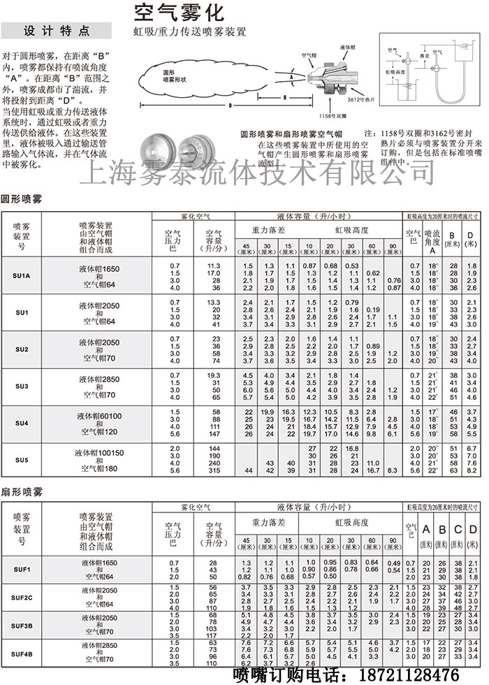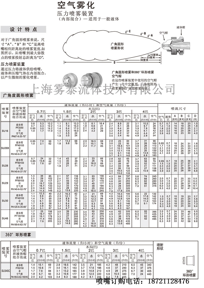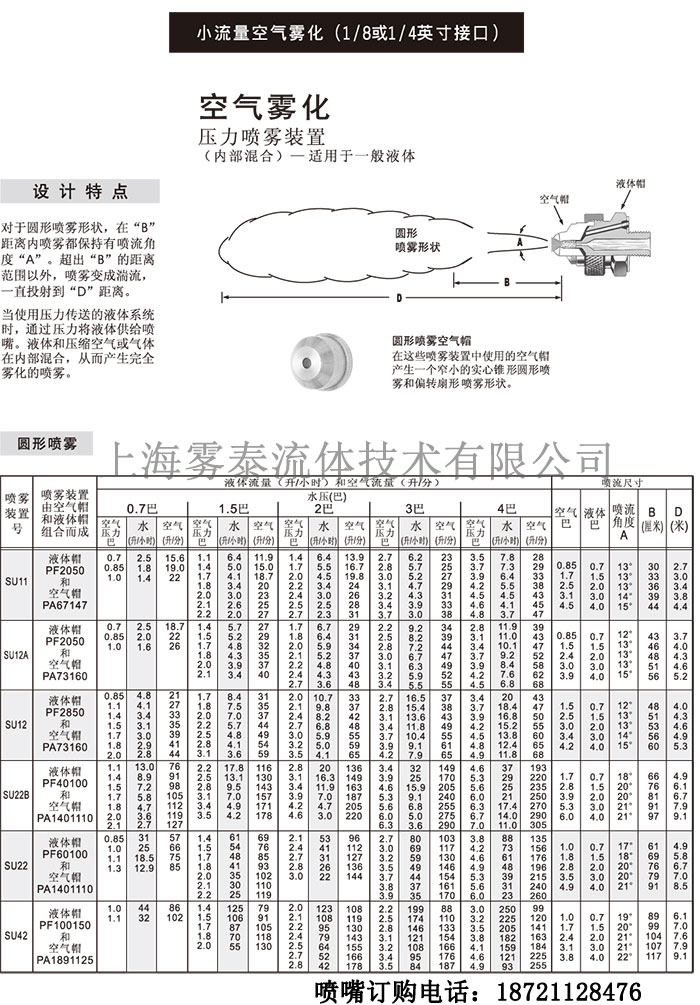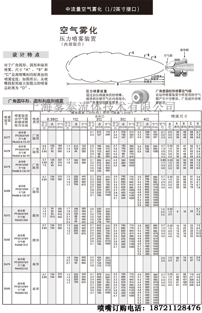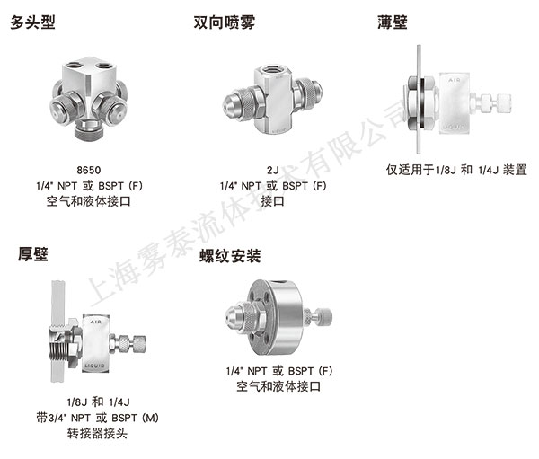 空氣霧化噴嘴 空氣霧化噴嘴 空氣霧化噴嘴又名二流體霧化噴嘴,可以噴水、潤滑油、過氧化氫等液體。適用于造紙、電子、食品和制藥行業(yè),加濕、噴涂、冷卻和潤滑等應(yīng)用?;拘吞枺篔,JN,JCO,JNCOJBC,JACN等,型號示例:1/4JN-SU13-SS 在線咨詢 產(chǎn)品詳情 通用空氣霧化噴嘴 空氣霧化噴嘴資料下載噴霧形狀有:扇形、圓形、廣角圓形可選。噴霧方式有:壓力式、虹吸重力式可選,(虹吸即不需要加水壓)空氣霧化噴嘴又稱為二流體噴嘴,其中二流體是指:液體、壓縮空氣。噴霧工作原理:液體+壓縮空氣混合,形成微小的液滴液體可以是:水、除臭劑、酒精、抗靜電劑、氨水、表面處理劑、油、雙氧水、帶一定粘度的液體等氣體可以是:壓縮空氣、蒸氣、惰性氣體等。應(yīng)用:氣霧模具潤滑、菇房加濕、礦區(qū)煤廠除塵、口罩無紡布噴霧噴嘴、食品行業(yè)糖漿等原料散布、空調(diào)排水蒸發(fā)等。 空氣霧化噴嘴特殊的內(nèi)部結(jié)構(gòu)設(shè)計能使液體和氣體均勻混合,產(chǎn)生微細(xì)液滴尺寸的噴霧或粗液滴噴霧。通常,通過增加氣體壓力或降低液體壓力可得到更加微細(xì) (30毫米左右)的液滴噴霧,從而達(dá)到較高的氣體流率與液體流率比。 可調(diào)形空氣霧化噴嘴能夠調(diào)節(jié)液體流量,在不改變空氣壓力和液體壓力的環(huán)境下,同樣可以產(chǎn)生合乎要求的噴霧,因此具有很強(qiáng)的適應(yīng)性。 每一種噴霧裝置均由空氣帽和液體帽組成,能夠提供扇形、圓形、廣角圓形三種噴霧模式,并有著廣泛的流量范圍。噴嘴體的入口接頭有多種尺寸,適合大多數(shù)常用的管道。 以上噴嘴部件可以互換,這為得到不同的噴霧性能提供了靈活機(jī)動性。 該空氣霧化噴嘴產(chǎn)生的微細(xì)液滴噴霧,能對周圍環(huán)境發(fā)揮很好的加濕作用。該系列噴嘴是要求有效濕度控制場所的理想選擇。 空氣霧化噴嘴噴霧效果展示(視頻需要緩沖加載時間,請稍等一會,如視頻不能播放,請更換瀏覽器重試。)
