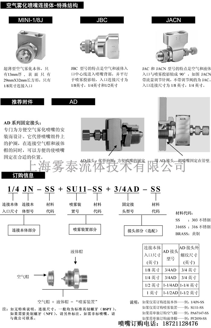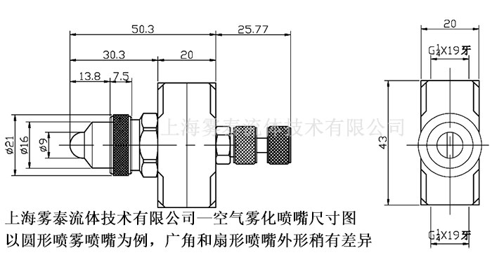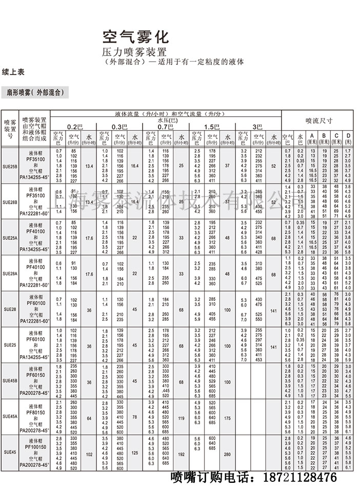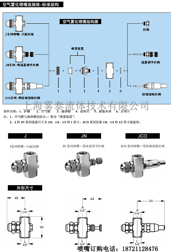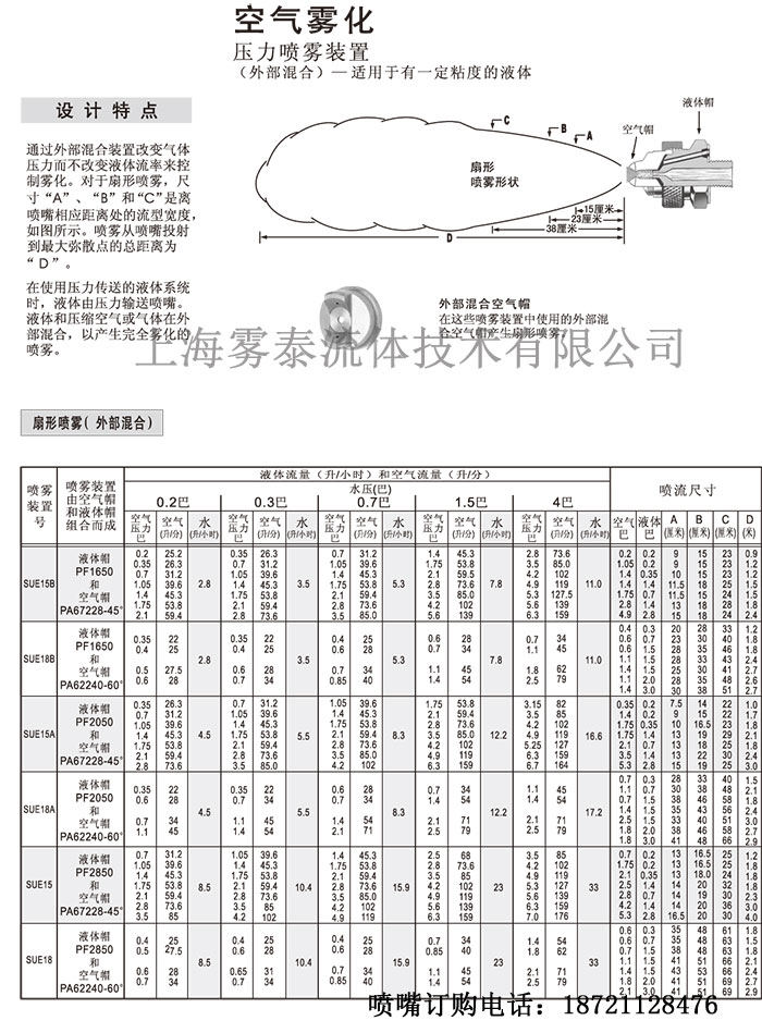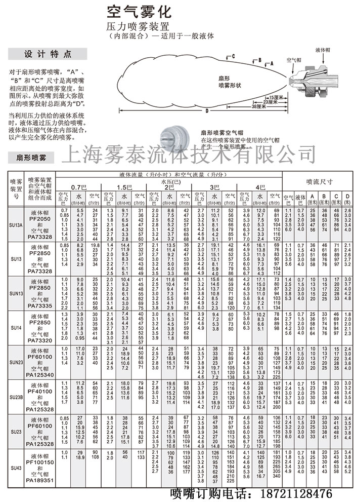 空氣霧化噴嘴 空氣霧化噴嘴 空氣霧化噴嘴又名二流體霧化噴嘴,可以噴水、潤滑油、過氧化氫等液體。適用于造紙、電子、食品和制藥行業(yè),加濕、噴涂、冷卻和潤滑等應(yīng)用?;拘吞枺篔,JN,JCO,JNCOJBC,JACN等,型號示例:1/4JN-SU13-SS 在線咨詢 產(chǎn)品詳情 通用空氣霧化噴嘴 空氣霧化噴嘴資料下載噴霧形狀有:扇形、圓形、廣角圓形可選。噴霧方式有:壓力式、虹吸重力式可選,(虹吸即不需要加水壓)空氣霧化噴嘴又稱為二流體噴嘴,其中二流體是指:液體、壓縮空氣。噴霧工作原理:液體+壓縮空氣混合,形成微小的液滴液體可以是:水、除臭劑、酒精、抗靜電劑、氨水、表面處理劑、油、雙氧水、帶一定粘度的液體等氣體可以是:壓縮空氣、蒸氣、惰性氣體等。應(yīng)用:氣霧模具潤滑、菇房加濕、礦區(qū)煤廠除塵、口罩無紡布噴霧噴嘴、食品行業(yè)糖漿等原料散布、空調(diào)排水蒸發(fā)等。 空氣霧化噴嘴特殊的內(nèi)部結(jié)構(gòu)設(shè)計能使液體和氣體均勻混合,產(chǎn)生微細(xì)液滴尺寸的噴霧或粗液滴噴霧。通常,通過增加氣體壓力或降低液體壓力可得到更加微細(xì) (30毫米左右)的液滴噴霧,從而達(dá)到較高的氣體流率與液體流率比。 可調(diào)形空氣霧化噴嘴能夠調(diào)節(jié)液體流量,在不改變空氣壓力和液體壓力的環(huán)境下,同樣可以產(chǎn)生合乎要求的噴霧,因此具有很強(qiáng)的適應(yīng)性。 每一種噴霧裝置均由空氣帽和液體帽組成,能夠提供扇形、圓形、廣角圓形三種噴霧模式,并有著廣泛的流量范圍。噴嘴體的入口接頭有多種尺寸,適合大多數(shù)常用的管道。 以上噴嘴部件可以互換,這為得到不同的噴霧性能提供了靈活機(jī)動性。 該空氣霧化噴嘴產(chǎn)生的微細(xì)液滴噴霧,能對周圍環(huán)境發(fā)揮很好的加濕作用。該系列噴嘴是要求有效濕度控制場所的理想選擇。 空氣霧化噴嘴噴霧效果展示(視頻需要緩沖加載時間,請稍等一會,如視頻不能播放,請更換瀏覽器重試。)